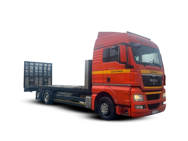 Das Fahrzeug MAN TGX mit einem Autotransportanhänger und zulässigem Gesamtgewicht von 12 600 kg, ausgestattet mit einer Winde für 16 Tonnen und Luftfederung. Durch den speziellen Aufbau können Wagen mit der Höhe von bis zu 3300 mm transportiert werden.
